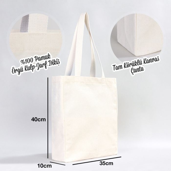 - Kanvas çanta boyutları 35x40x10 cm (ürünler el dikimi olduğundan +/- 1cm ölçülerinde küçük farklılıklar olabilmektedir)